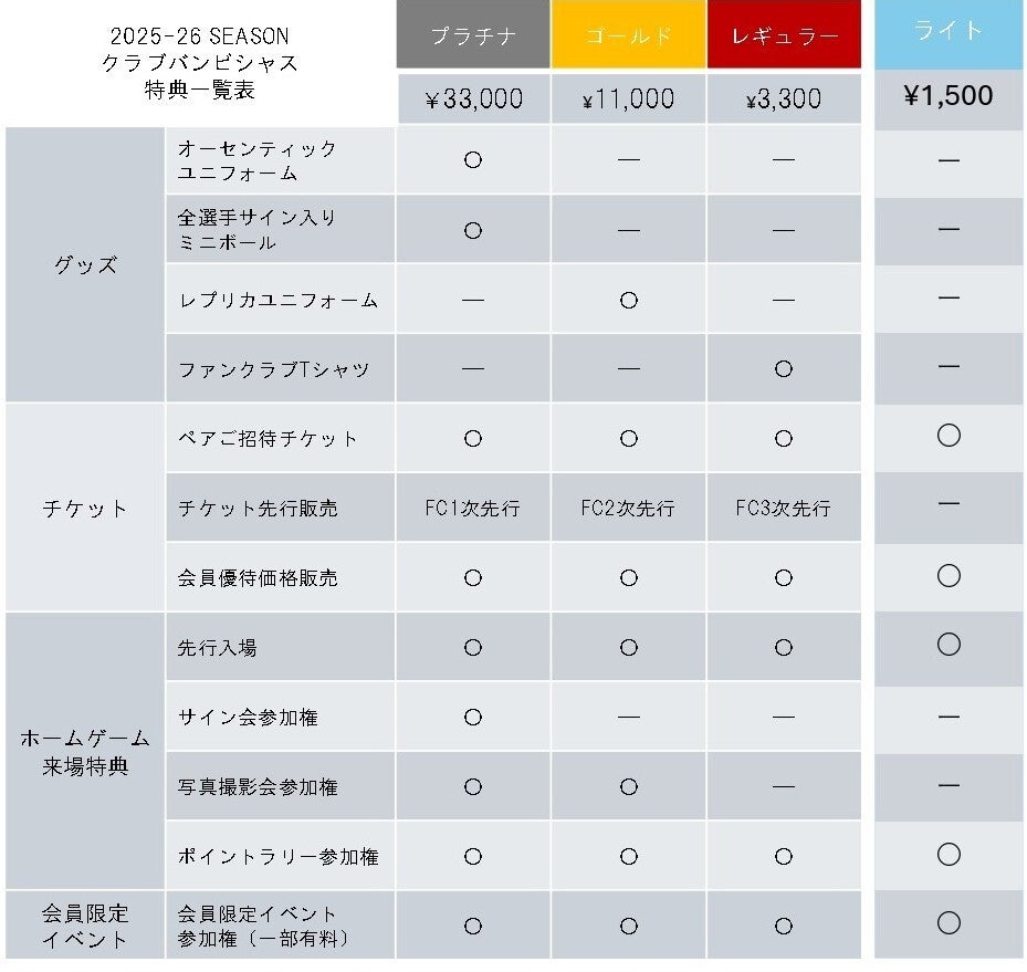 2024-25シーズンのクラブバンビシャスへWEBからクレジットカード決済を選択しご入会いただいた方で、自動継続更新を設定されている方は2025-26シーズンのクラブバンビシャスへの自動継続更新対象となります。対象の方は2025年7月1日に年会費が自動決済されます。下記ボタンより、詳細を必ずご確認ください。