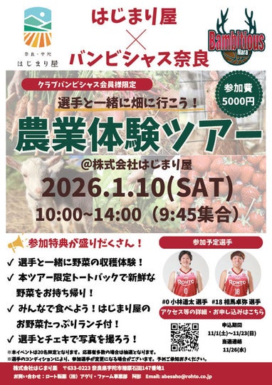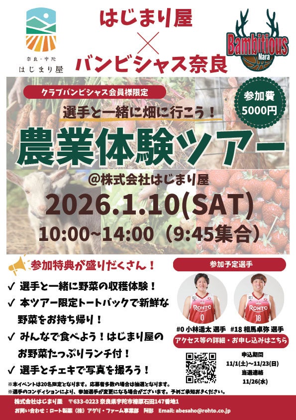 バンビシャス奈良では、オフィシャルパートナーであるはじまり屋様と、クラブバンビシャス会員限定のイベント、“選手と一緒に畑に行こう! 農業体験ツアー”を、2026年1月10日に実施いたします!