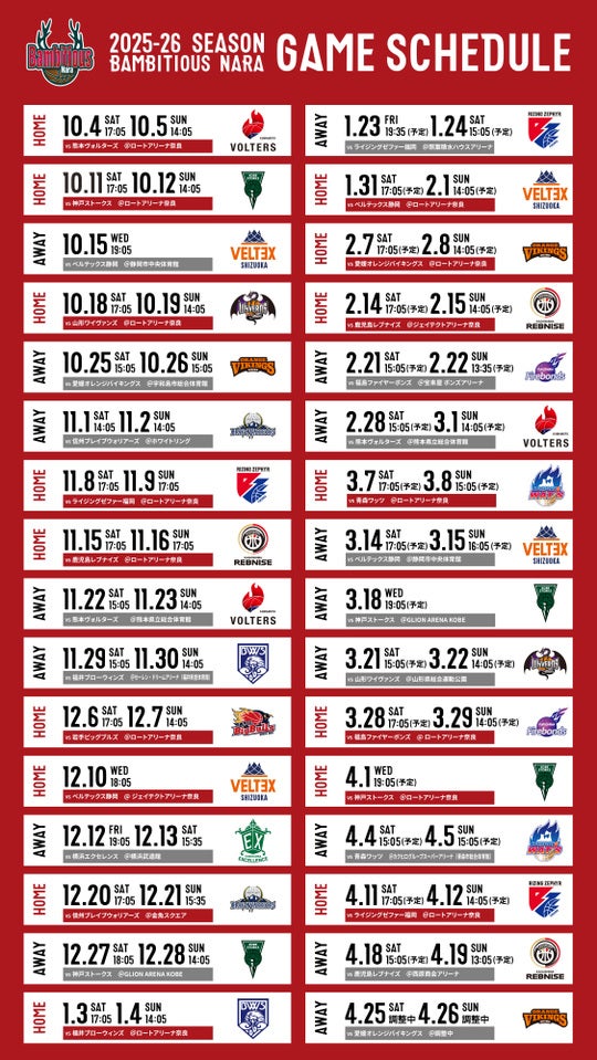 GAME 2025.09.22 ※9/22更新※りそなグループ B.LEAGUE 2025-26シーズン 試合日程のお知らせ 【9/22更新】4月4日(土)、5日(日)のアウェー青森ワッツ戦の試合会場が、カクヒログループスーパーアリーナ(青森市総合体育館)に決まりました。 いつもバンビシャス奈良を熱く応援いただき、ありがとうございます。 バンビシャス奈良のりそなグループ B.LEAGUE 2025-26シーズンの試合日程が決定いたしましたのでお知らせいたします。 試合日程は予定であり、状況により変更となる場合がございます。