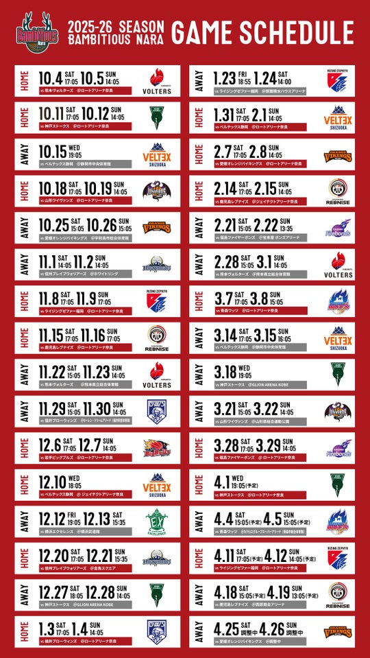 バンビシャス奈良のりそなグループ B.LEAGUE 2025-26シーズンの試合日程が決定いたしましたのでお知らせいたします。