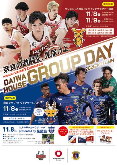 11月8日(土)、9日(日)のロートアリーナ奈良でのホームゲームは、大和ハウス工業株式会社様ご協賛の冠ゲームとなり、Daiwa House presents ライジングゼファー福岡戦『DAIWA HOUSE GROUP DAY 2025 AUTUMN』として開催します。