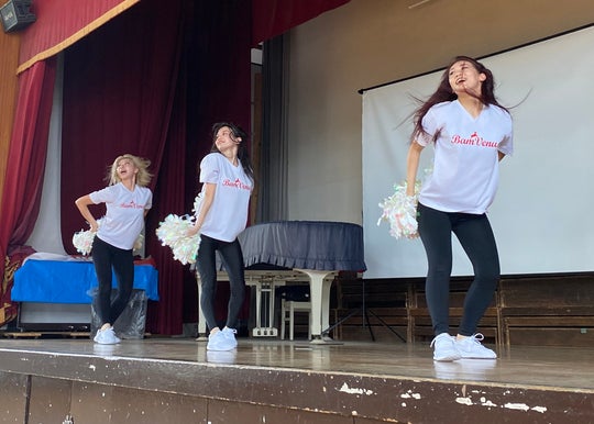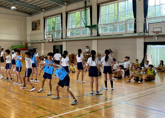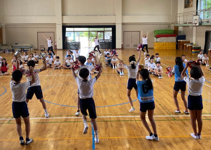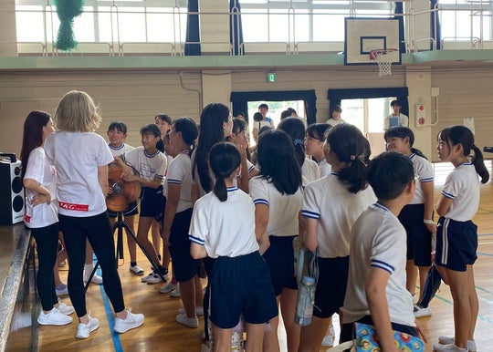 9月17日、バンビーナスのアスカとコマチ、サアヤが、奈良市立青和小学校を訪問し、6年生と一緒に、チアダンスだけでなく、ヒップホップダンスを踊りました。