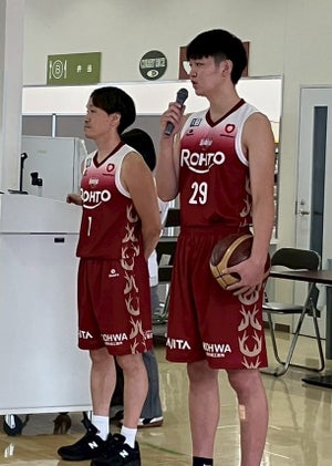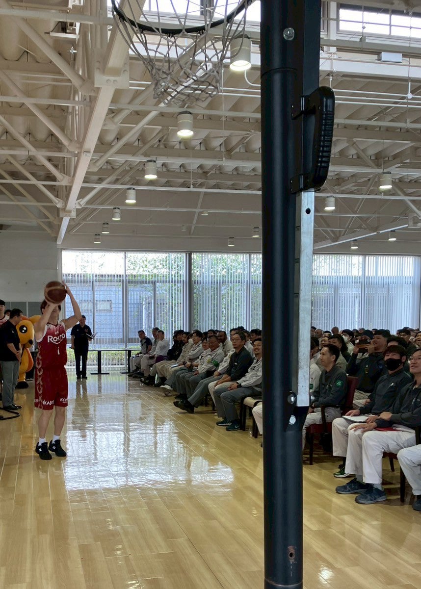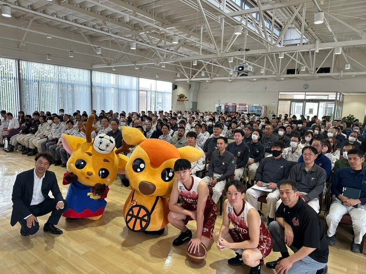 バンビシャス奈良の選手は、新シーズンに向けての抱負もお伝えした後、大塚選手はジャンプシュートを、間山選手はダンクシュートを披露しました。最後はバンビシャス奈良、奈良クラブ、社員の皆さまと集合写真を撮影しました。
