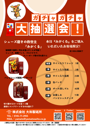ブースでは、同社製品の“シューズ磨きの救世主「みがくる」”のバンビシャス奈良特別パッケージバージョン(税込1,650円)が販売されます!この特別パッケージは、全13種類(ナイジェル・スパイクス選手を除く選手12名とシカッチェ)があり、カード部分を切り離せば選手カードとして楽しめますので、ぜひ13種類をコンプリートしてください。さらに、こちらを購入すると、バンビシャス奈良グッズが当たる、ガチャガチャ大抽選会に参加することができます!