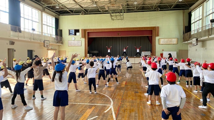 準備運動の後、まずは振付を覚えていきます。先生方も一緒に振付の練習をしてくださったこともあって、元気いっぱいで、とても積極的な三碓小学校のみんなは、あっという間に振付をマスターしてくれました。バンビーナスの3人も「覚えるのが早い!」と感心していました。