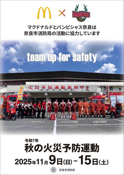 来たる11月10日、バンビシャス奈良では、マクドナルド、奈良市中央消防署と合同で、“火災予防運動イベント”をマクドナルド奈良北店にて実施いたします。このイベントには、坂口竜也選手と中谷衿夢選手も参加予定です。さらに、シカッチェと奈良市消防局公式マスコットキャラクターのなっぴぃも出演します!