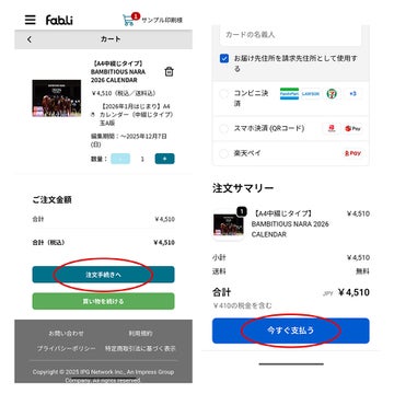 ②注文手続きに進む:カート画面を開き、「注文手続きへ」のボタンを押してください。ご連絡先、配達方法、決済方法などの情報を入力し、「今すぐ支払う」で決済を完了してください。