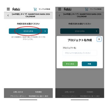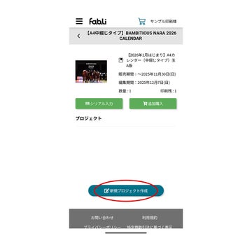 ①編集を開始:fabliメニューで、「マイプロジェクト編集」を選択、「新規プロジェクト作成へ。