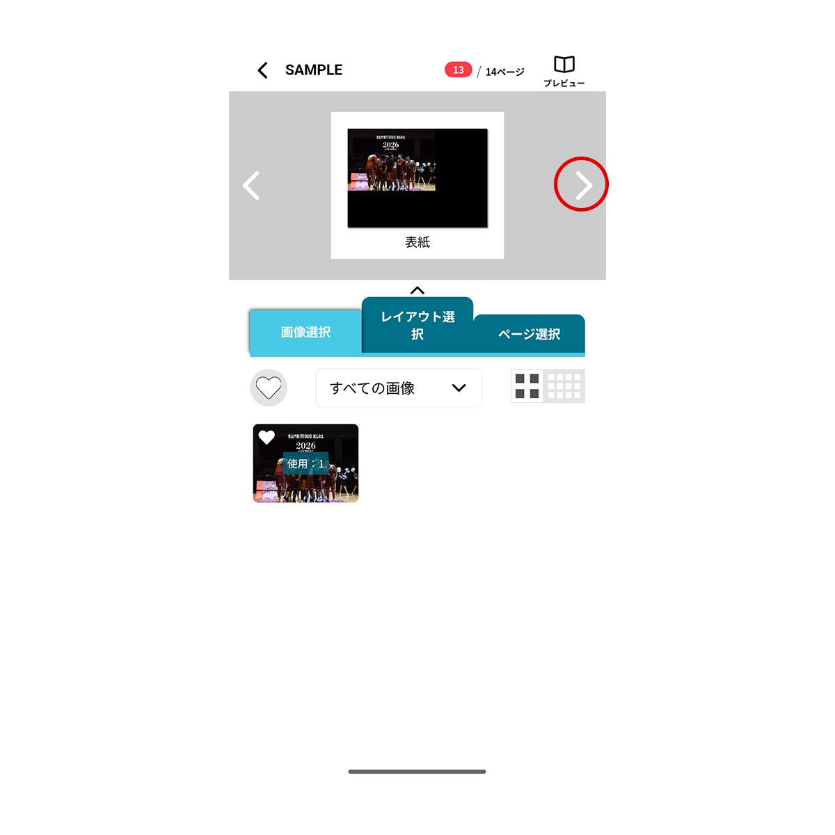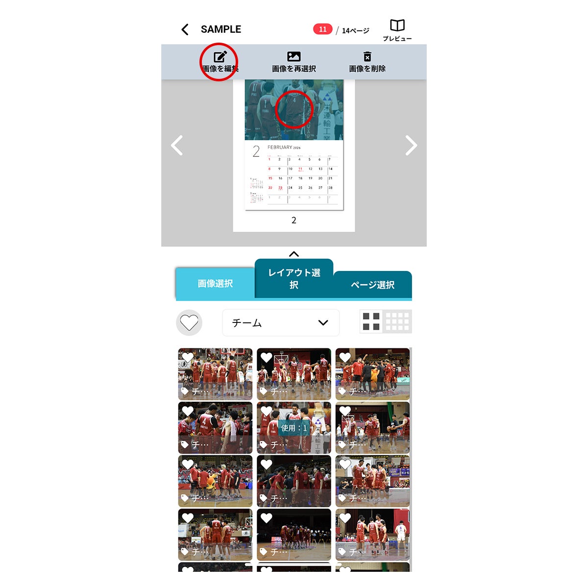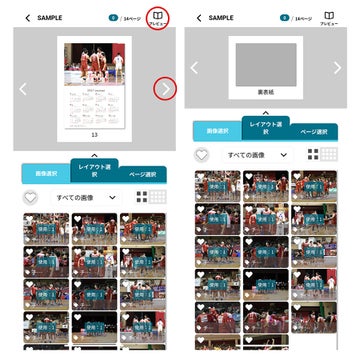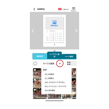 ④写真の選択:最初は全画像が表示されます。「すべての画像」のプルダウンを選択し、選手名等で絞り込んでから写真選択が可能ですので、ご活用ください