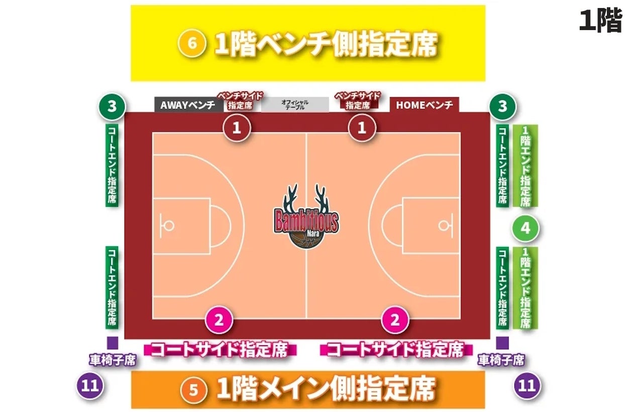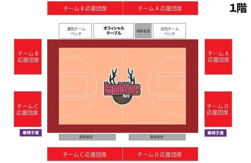 ※1階席チケットをお持ちの方も、「応援団席整理券」をお持ちでない場合は、奈良県ミニバスケットボール選手権大会開催中には、2階自由席でのご観戦をお願いいたします(2階指定席にはお座りいただけません)。ご了承願います。