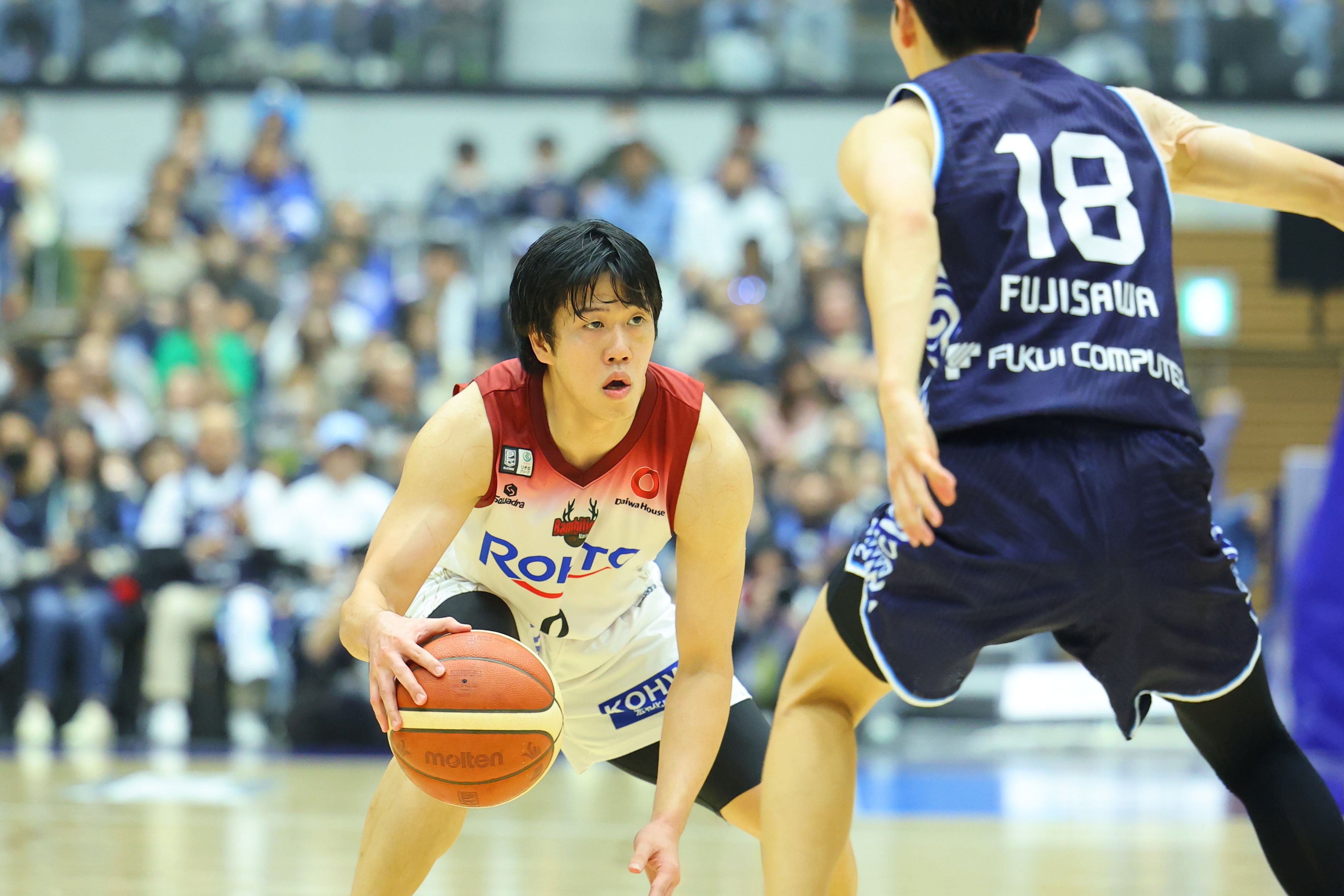 1Q、本多選手のドライブで先制すると、スパイクス選手のアシストからブレイクフィールド選手がコーナースリーで続きます。ブレイクフィールド選手がさらにペリメーターショットを、小林選手がアタックを仕掛けてのタフショットを決めきり、中盤までは1点を争う展開となりました。しかしこのクォーター、福井の3Pシュートが高確率で5本決まったこともあり、終盤にかけて点差が開き、15-25となりました。