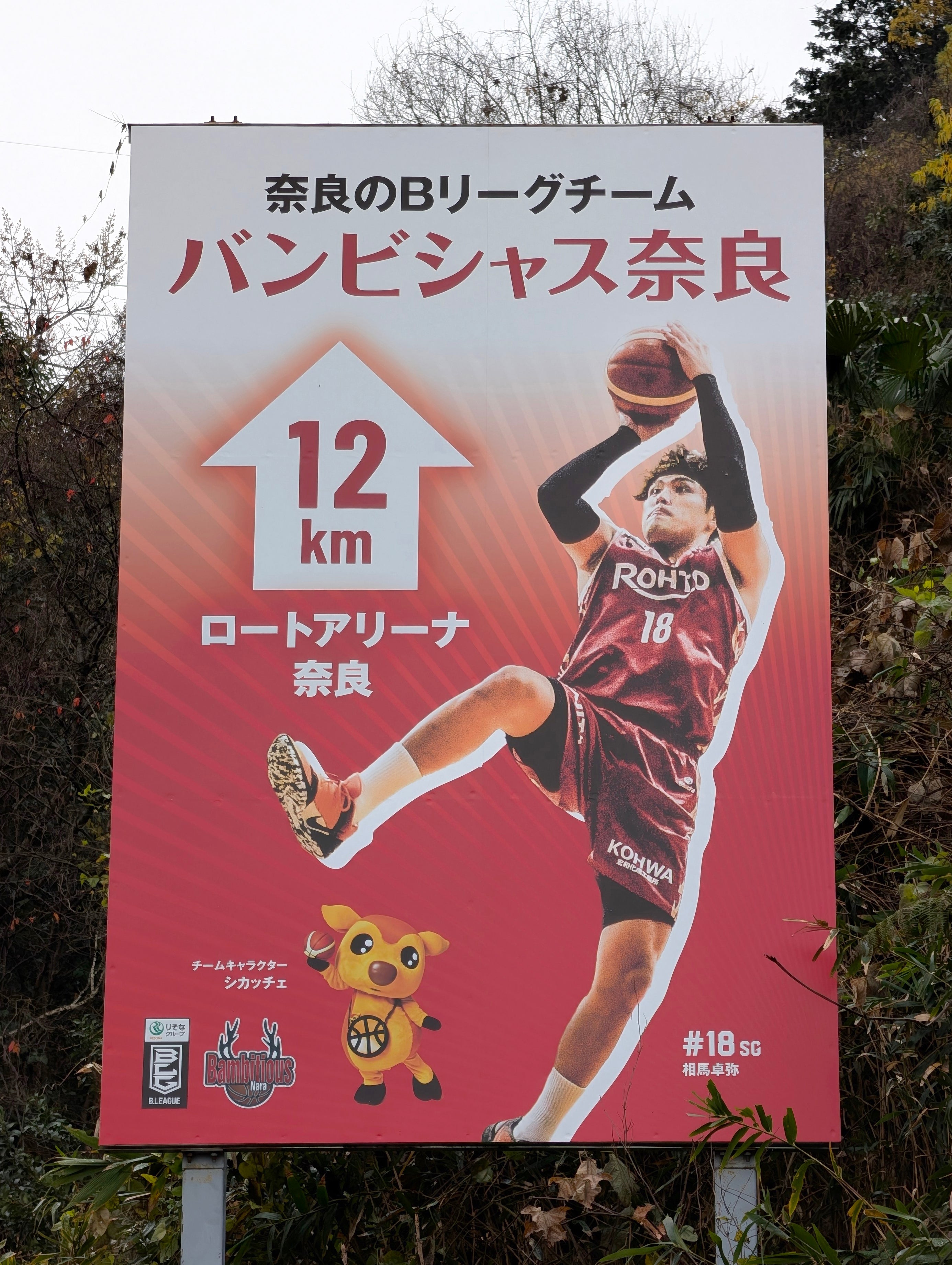 相馬卓弥選手のシグネチャームーブ、“フェイダウェイシュート”でバスケットボールの躍動感を、そしてロードサインらしく(!?)ロートアリーナ奈良までの距離を表現しました