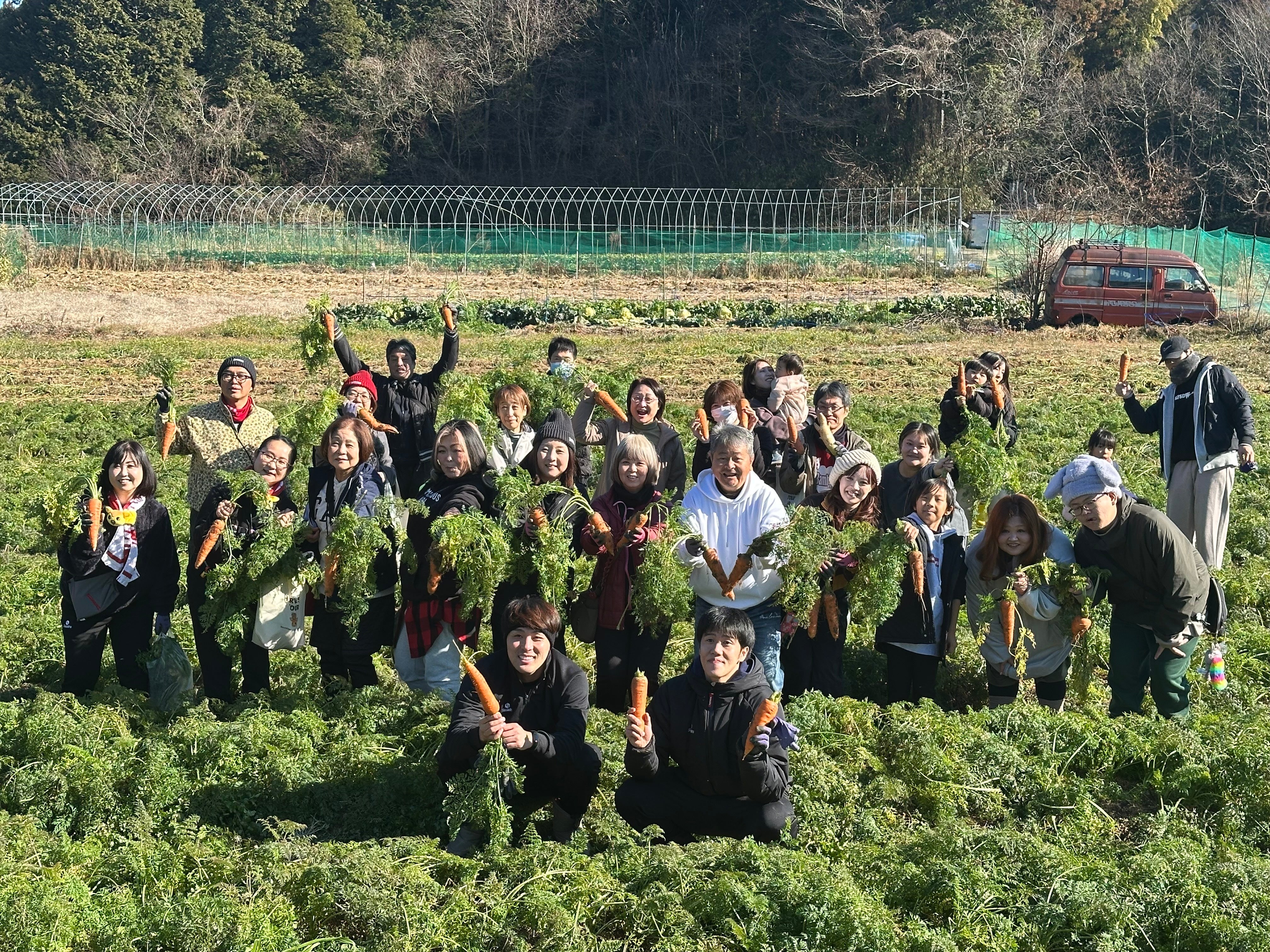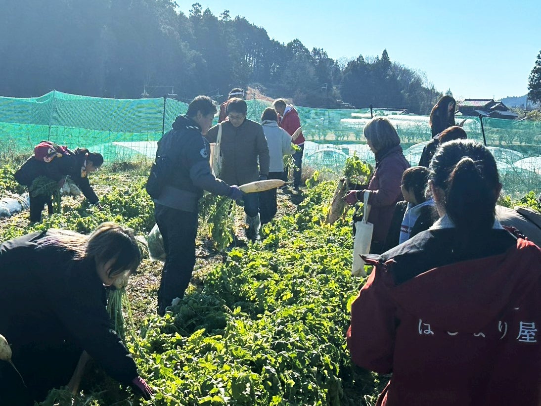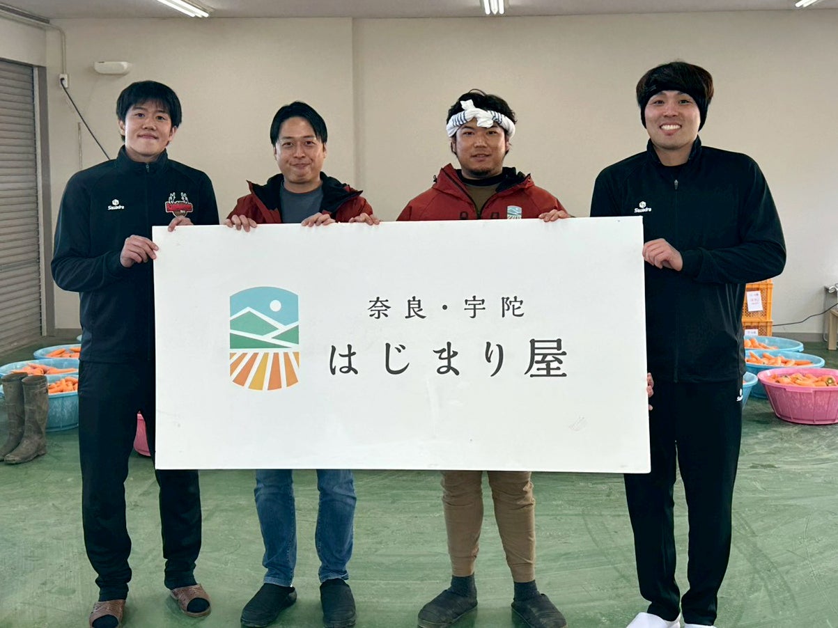 バンビシャス奈良は、1月10日、小林遥太選手と相馬卓弥選手が参加する、オフィシャルパートナーのはじまり屋様とのコラボイベント、“選手と一緒に畑に行こう! 農業体験ツアー”を実施しました。このイベントは、クラブバンビシャス会員の方を対象とした限定イベントで、およそ20名の方にご参加いただきました。
