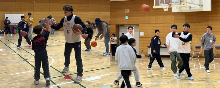 親子を対象にした第2部は、坂口選手と中谷選手がバスケットボール教室を開催。親子で楽しみながらバスケットボールに親しめる動きやシュート対決を行い、最後には選手たちも混ざって試合を行いました。