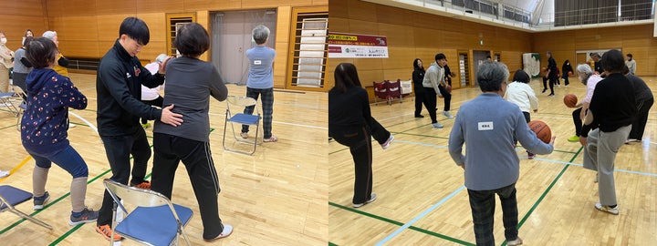 ケガ予防を目的に、高齢の方を対象とした第1部では、宮本ATが自宅でも簡単に取り組めるストレッチや筋力トレーニングについて紹介し、参加者の皆さんと一緒に実施しました。また、坂口選手がドリブルやシュートのドリルで、参加者に身体を動かしてもらい、バスケットボールを体験していただきました。