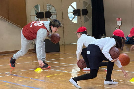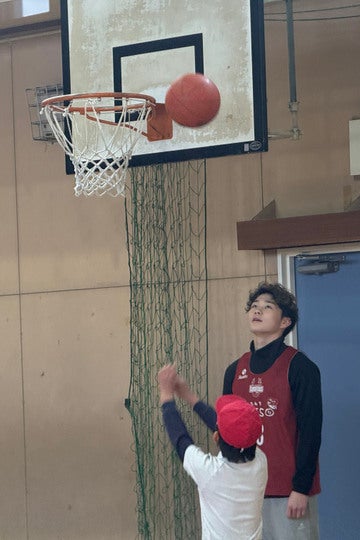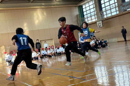 2月9日、坂口竜也選手と中谷衿夢選手が、大和郡山市立昭和小学校を訪問し、5年生の皆さんと、バスケットボールをプレーして一緒に汗を流しました。