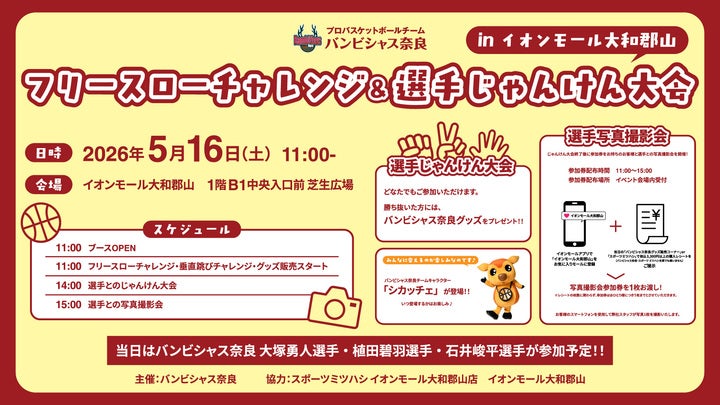 5月16日、イオンモール大和郡山にて、大塚勇人選手、植田碧羽選手、石井峻平選手とのじゃんけん大会や、来場いただいた皆さんに参加いただくチャレンジイベント(フリースローチャレンジ、垂直跳びチャレンジ)を開催します!