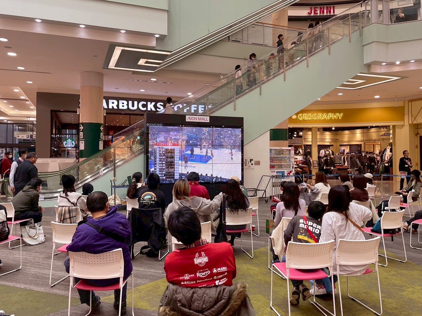 午後からは、福井ブローウィンズ戦を上映。日頃より応援いただいているブースターの皆さまや、お買い物中に足を止めて観戦してくださった地域の皆さまから熱いご声援をいただき、スタッフ一同大変うれしく思いました。