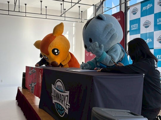 京都ハンナリーズとバンビシャス奈良、両チームたくさんのブースターの皆さんに見守られながら、ふたり仲良くお友達協定書にサインをしました!